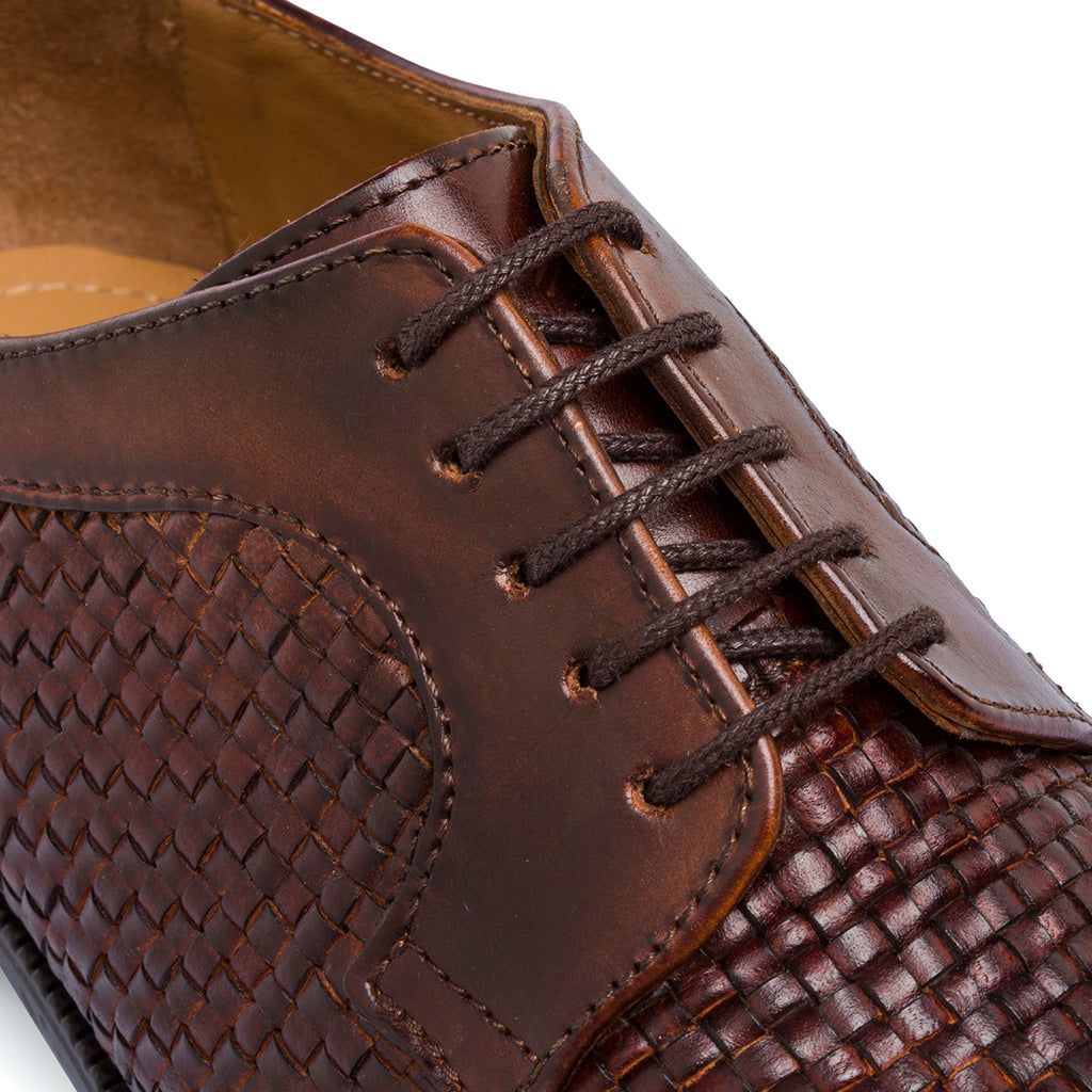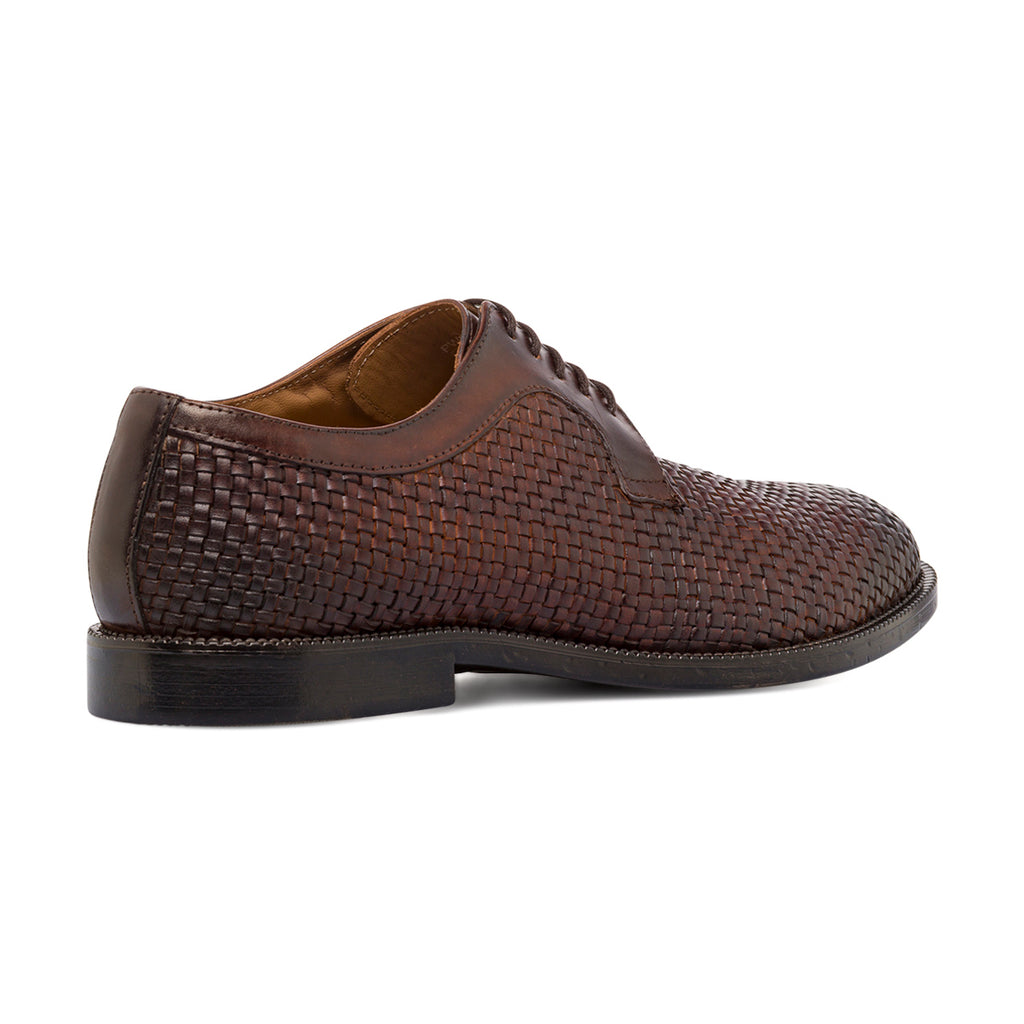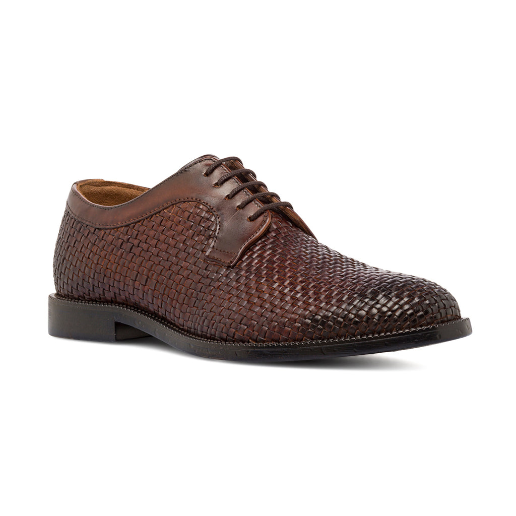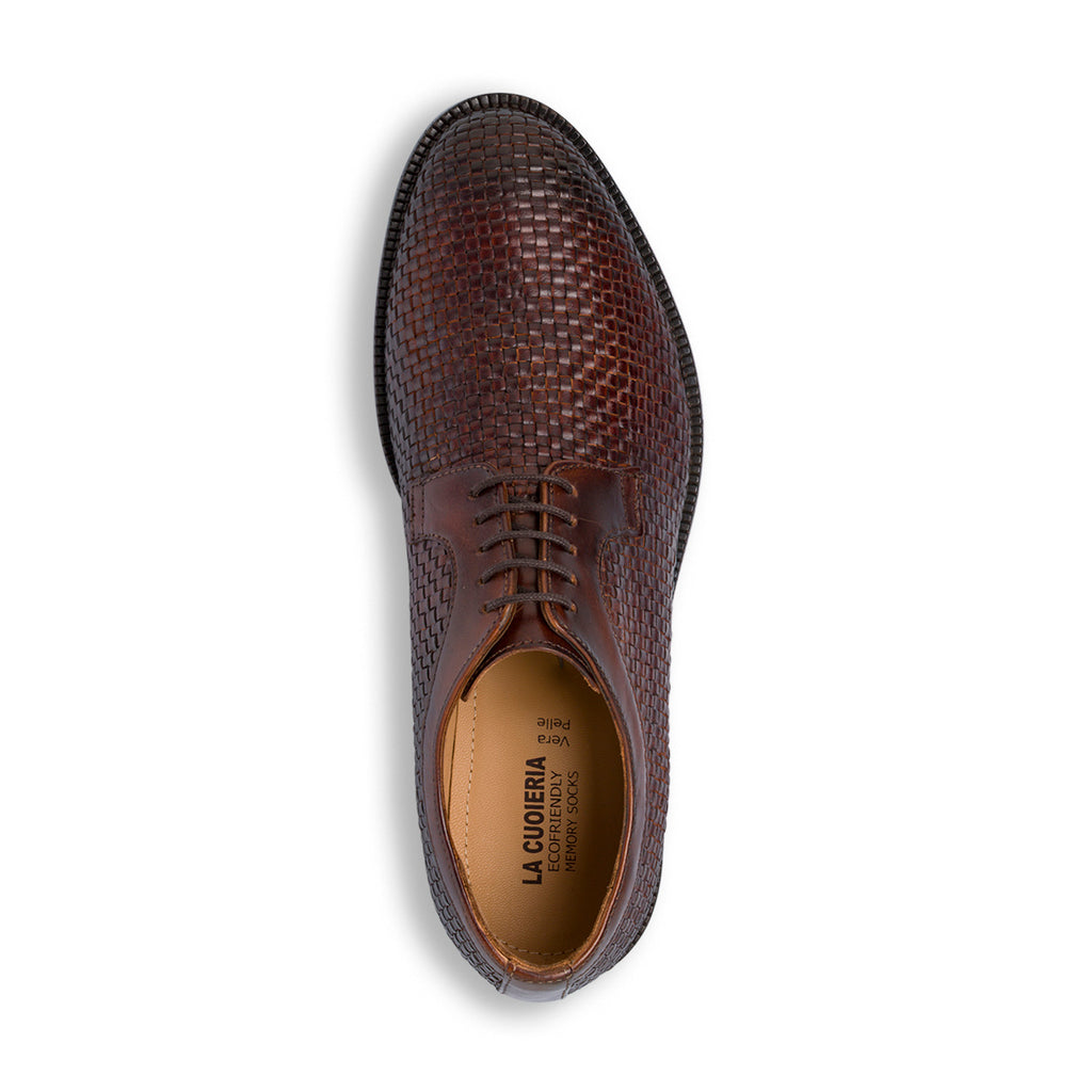 Stringate eleganti da uomo La Cuoieria in pelle lavorata colore marrone, con tomaia in pelle, sottopiede e fodera in pelle misto materiale tessile e allacciatura Derby.